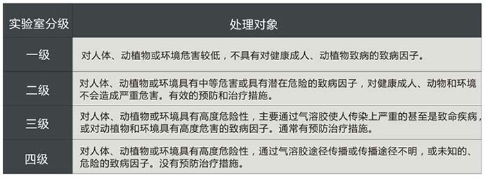 生物安全實(shí)驗(yàn)室,也就是生物實(shí)驗(yàn)室,是進(jìn)行與生物科相關(guān)的實(shí)驗(yàn)的場所。隨著對(duì)質(zhì)量控制的要求越來越嚴(yán)格,恒溫恒濕環(huán)境的需求越來越大,應(yīng)用的領(lǐng)域也越來越寬廣。一般學(xué)校里都會(huì)有生物實(shí)驗(yàn)室,醫(yī)院的驗(yàn)血實(shí)驗(yàn)室也是生物安全實(shí)驗(yàn)室。通常進(jìn)到生物實(shí)驗(yàn)室里都是為了學(xué)習(xí)和研究,而按照研究對(duì)象的不同而進(jìn)行分級(jí),一共分為四級(jí)。依據(jù)實(shí)驗(yàn)室所處理對(duì)象的生物危險(xiǎn)程度,把生物安全實(shí)驗(yàn)室分為四級(jí),其中一級(jí)對(duì)生物安全隔離的要求最低,四級(jí)最高。生物安全實(shí)驗(yàn)室的分級(jí)見表: